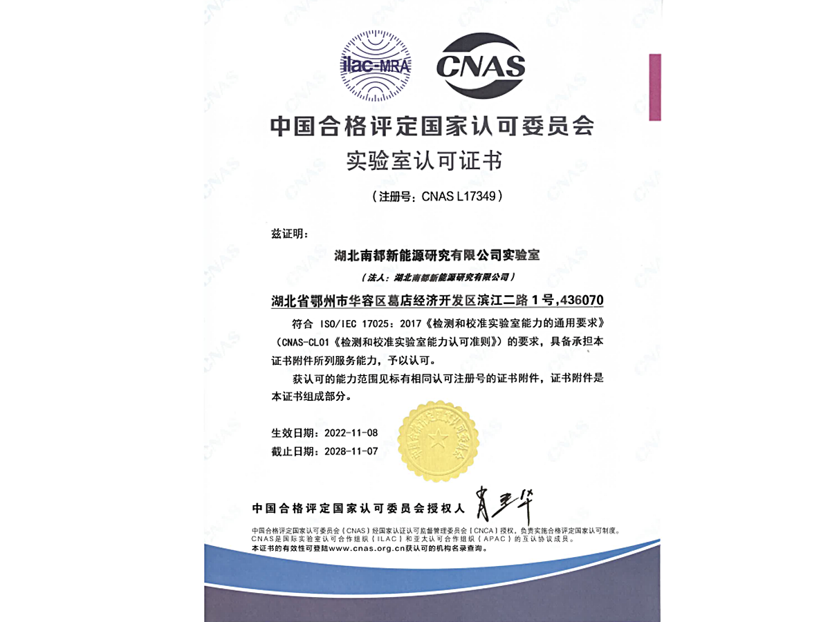日前,湖北实亿国际网站新能源研究有限公司(简称“湖北研究院”),正式通过中国及格评定国家认可委员会(CNAS)的认可,荣获CNAS实验室认可证书(注册号:CNAS L 17349)。