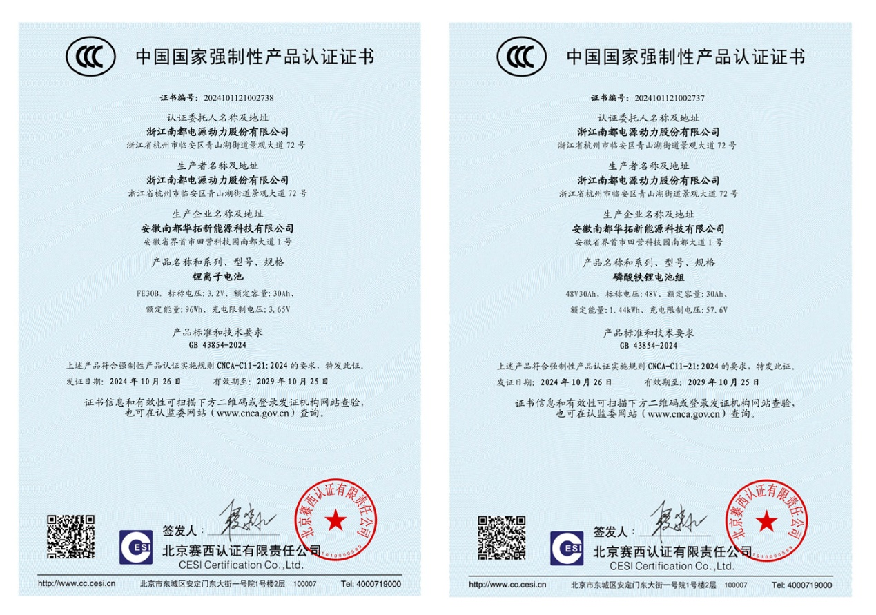 此次获得CCC认证,标记着实亿国际网站电动自行车锂电池知足过充、过放、短路、针刺等清静要求,电池组的电气清静、机械清静、情形清静、热扩散、互认协同充电等切合强制性国家标准划定要求。